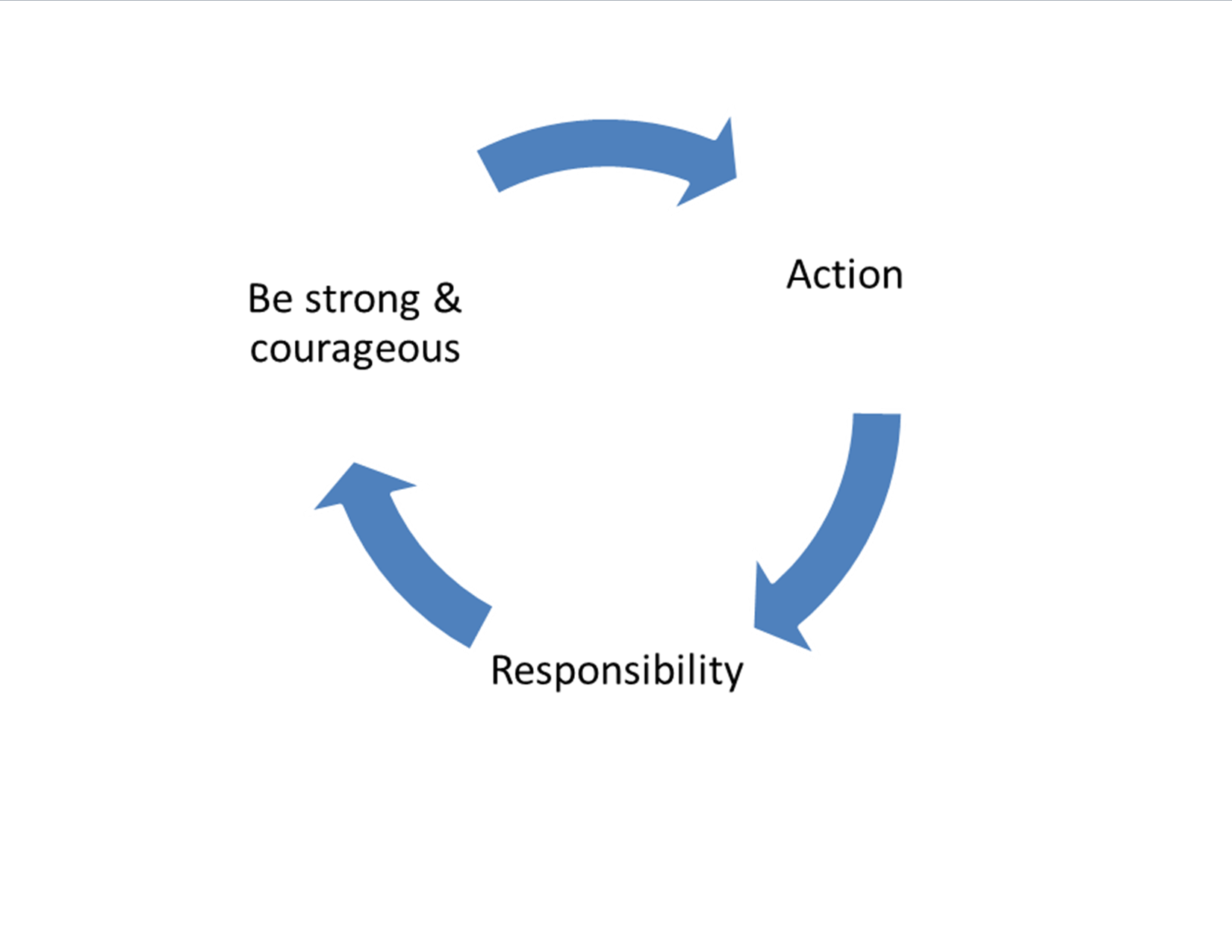 In conclusion, these three marks of leadership in men seem to connect well together: be a man of action, accept responsibility, be strong and courageous. The connection can go full-circle: when a man rises up to take action, he will accept responsibility. In his responsibility he must be strong and will often be required to demonstrate courage while standing firm in the action and carrying responsibility. It can be illustrated this way: